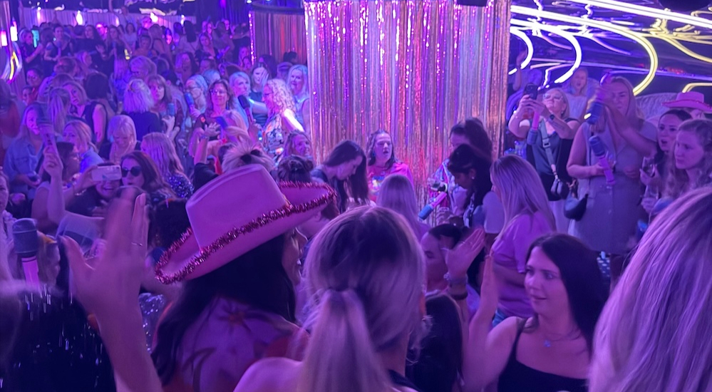 The vibe is closer to a giant singalong party than a traditional night out. A high-energy DJ and MC keep the music rolling while the crowd becomes the real headliner. Inflatable microphones bounce around the dancefloor. Confetti cannons and cold sparks add a little spectacle. Glitter makes an appearance because of course it does. By the time the chorus hits, everyone is involved.